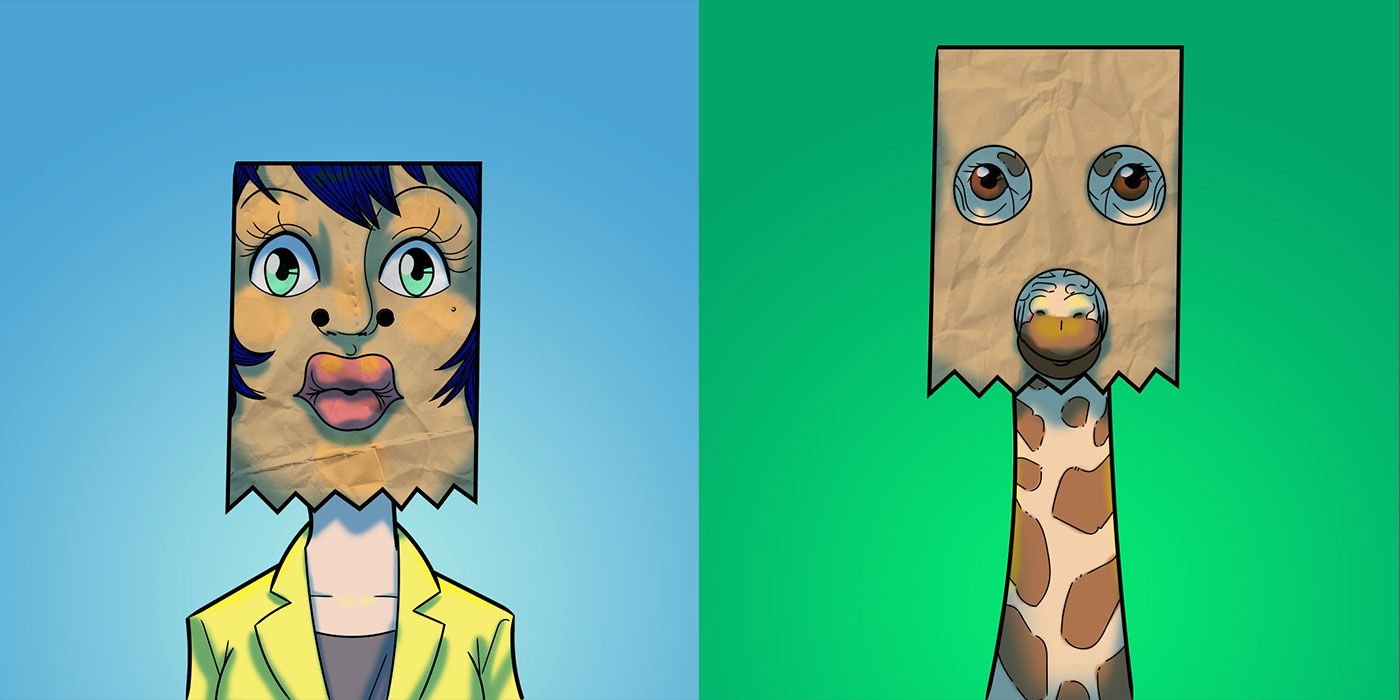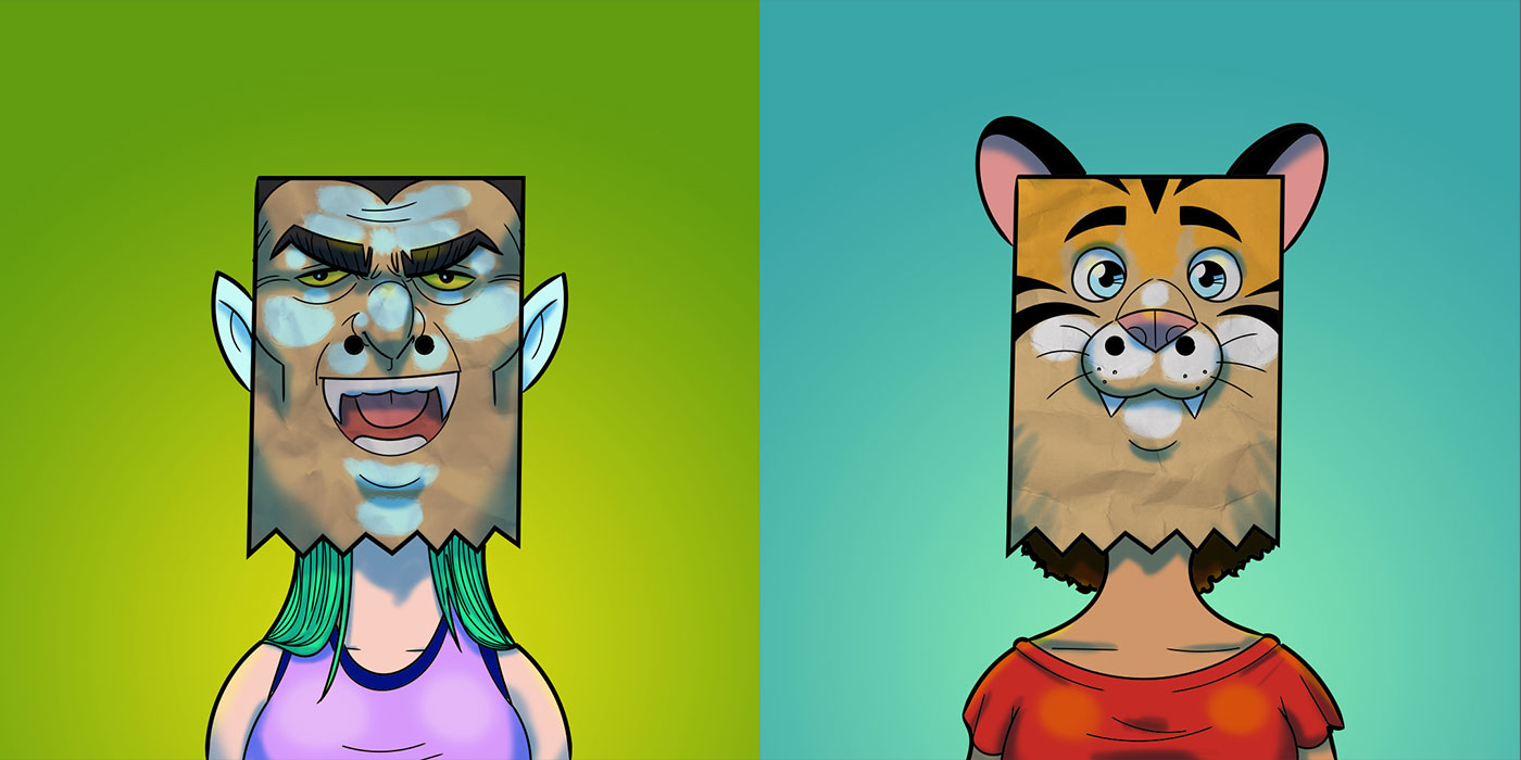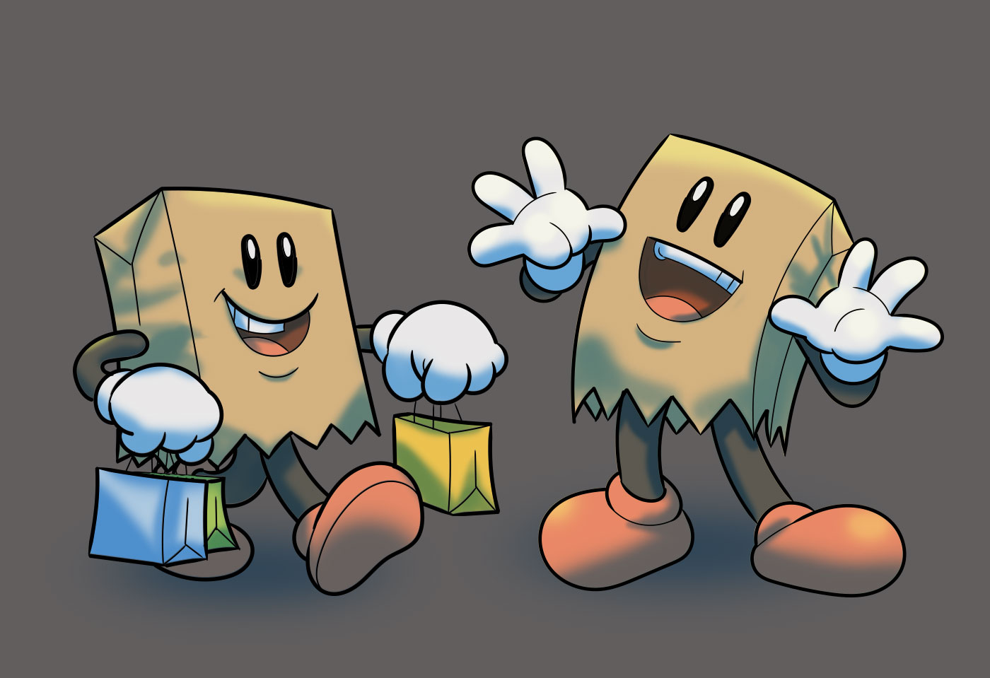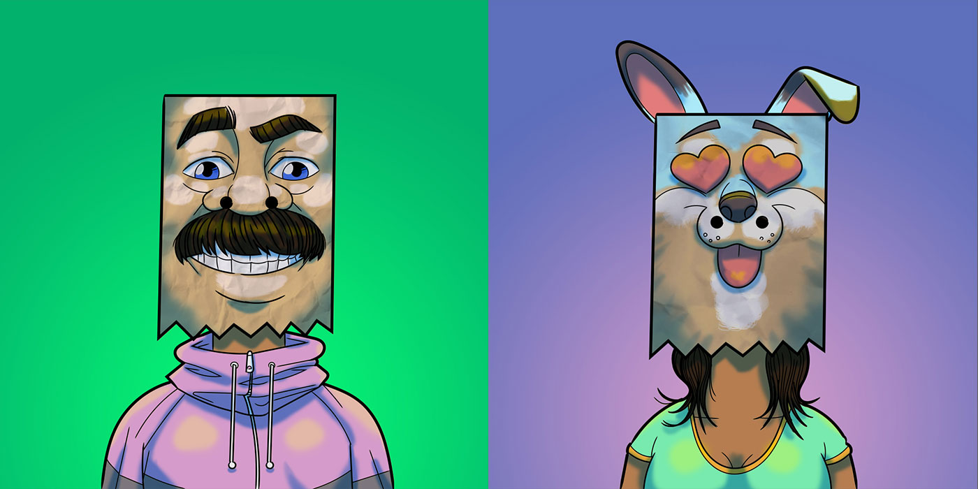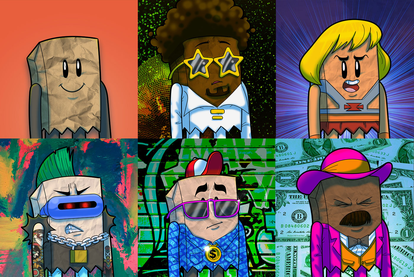 O projeto Masky precisou de um mascote para apresentar as coleções de NFT do site. Era um saco de papel humanizado com uma estética retrô feito em diversas poses e situações para ilustrar as situações da comunidade.